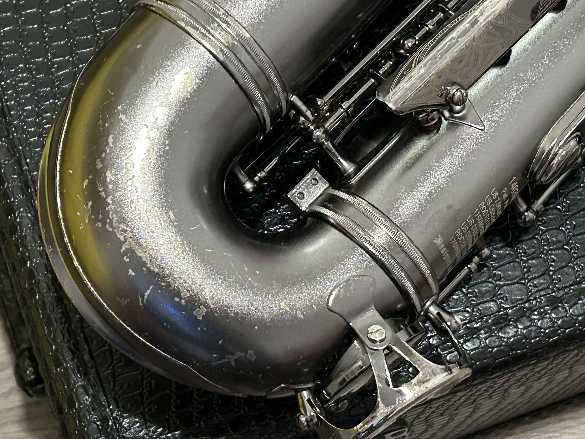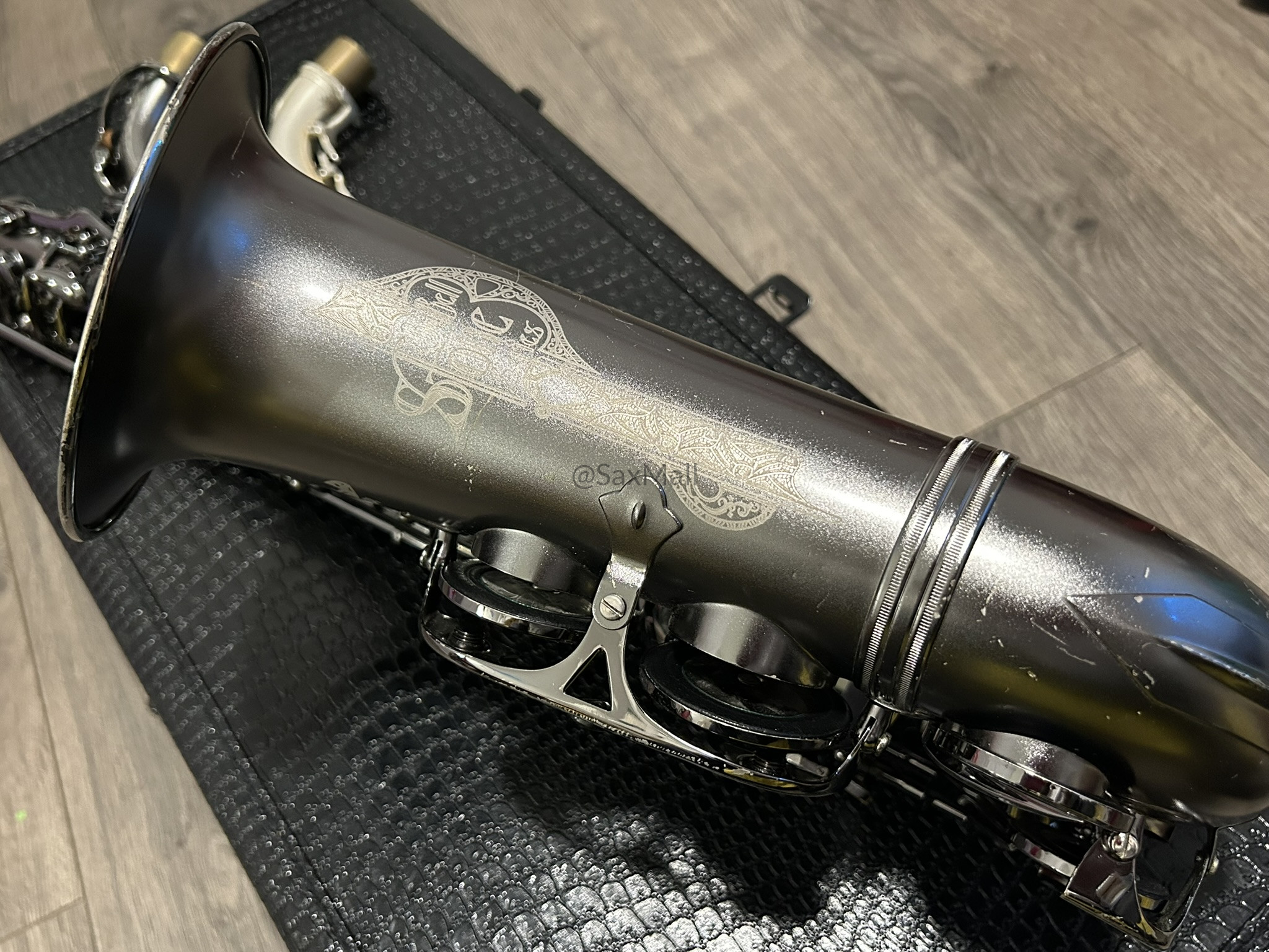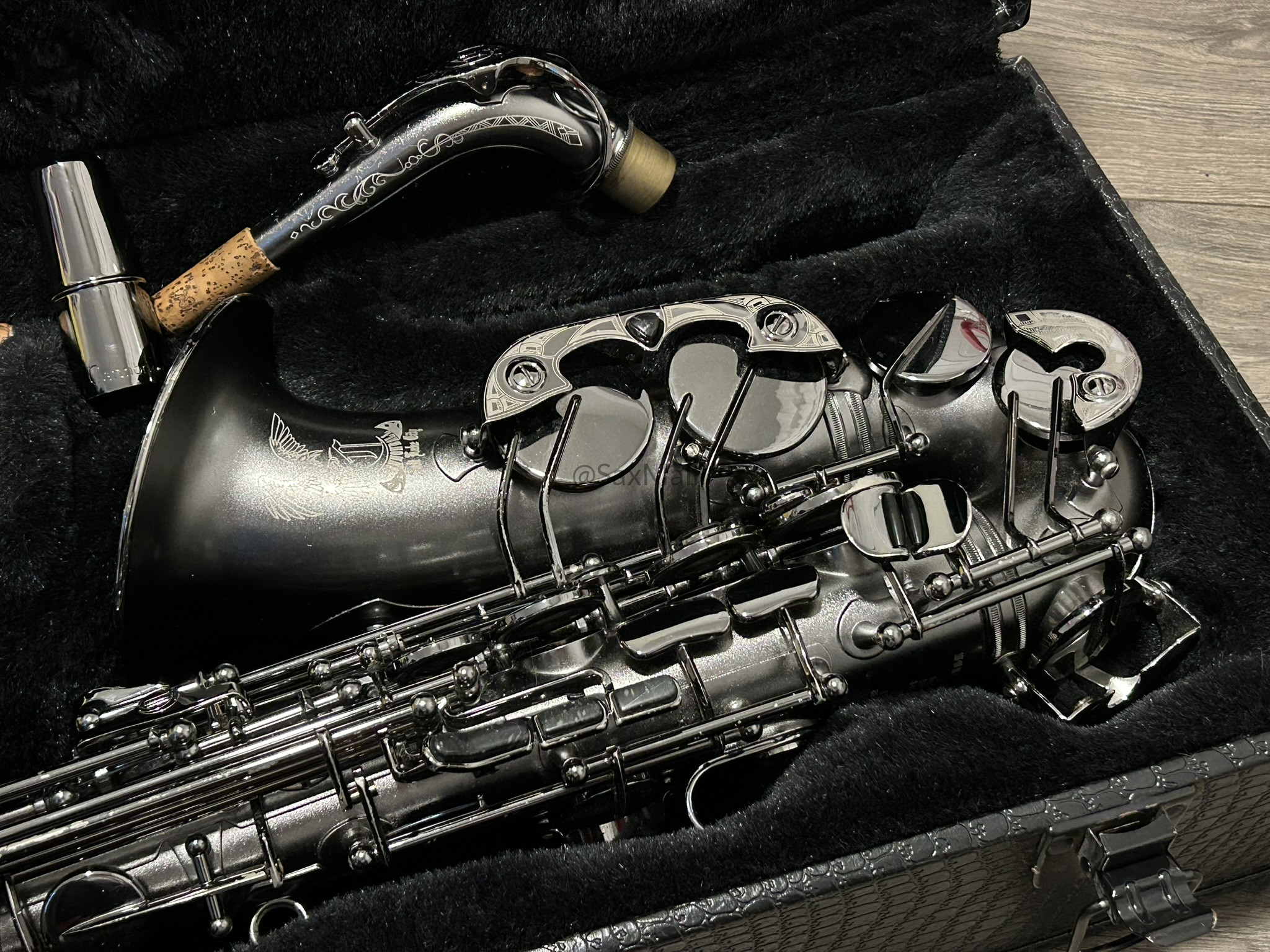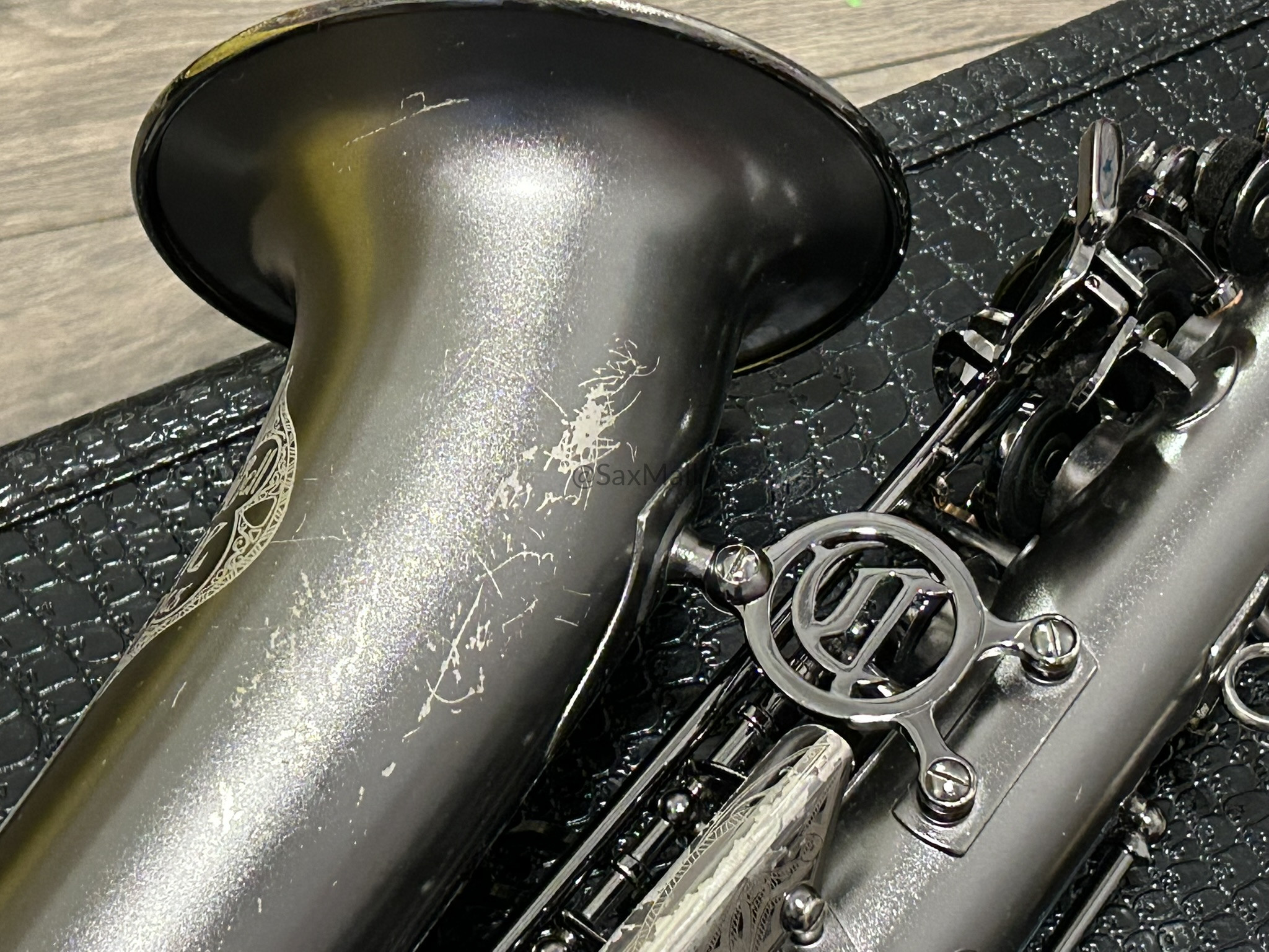 The saxophone is in good overall condition and plays well with no major mechanical issues—pads, corks, and felts are serviceable (recent regulation/setup recommended for optimal performance, as with any used pro horn). It has typical surface scratches and wear in spots from normal use (visible on the body and keys in photos), but no dents, dings, or soldered repairs. The Raven finish still looks striking with its dark, matte iced black-nickel vibe.
