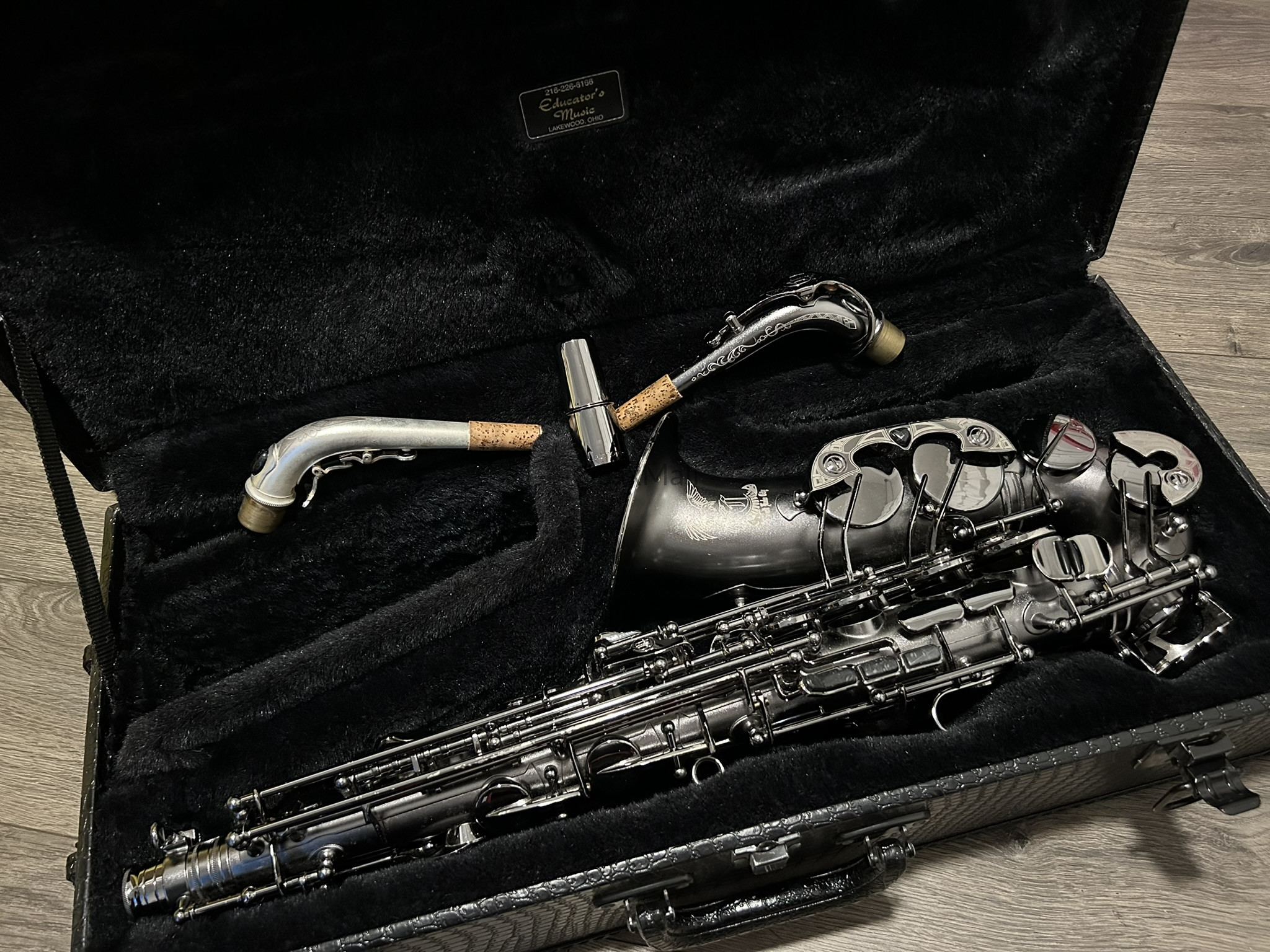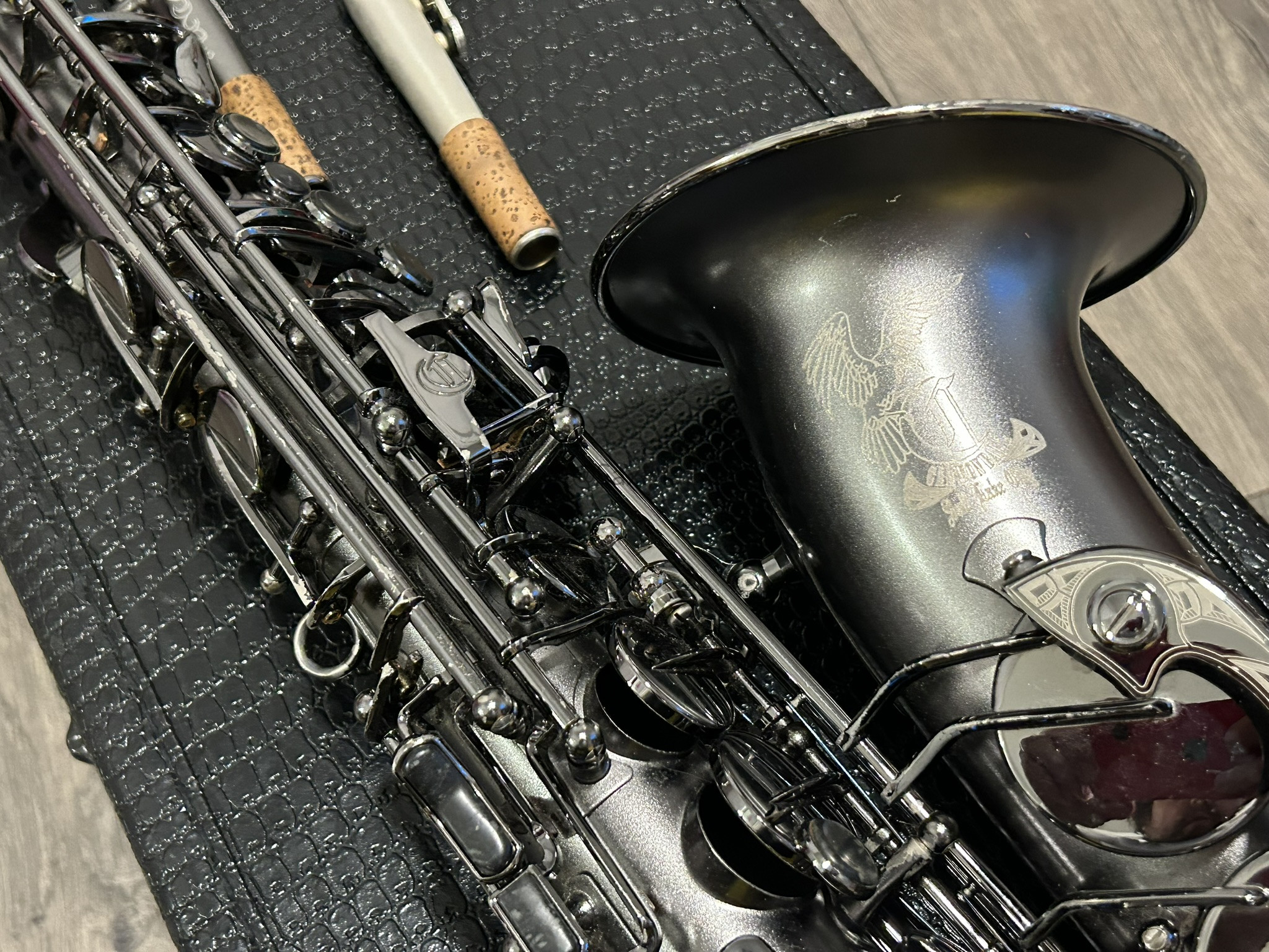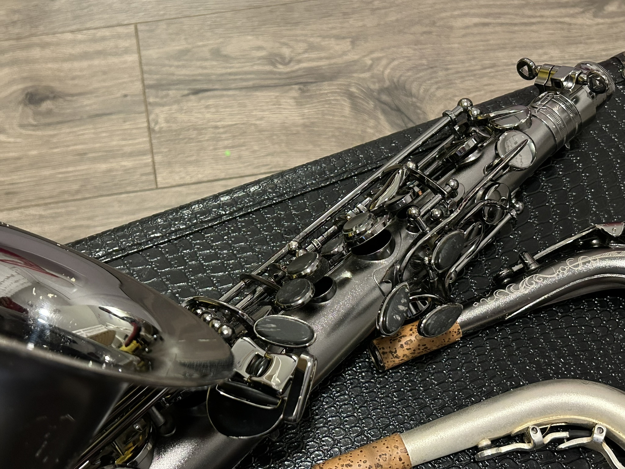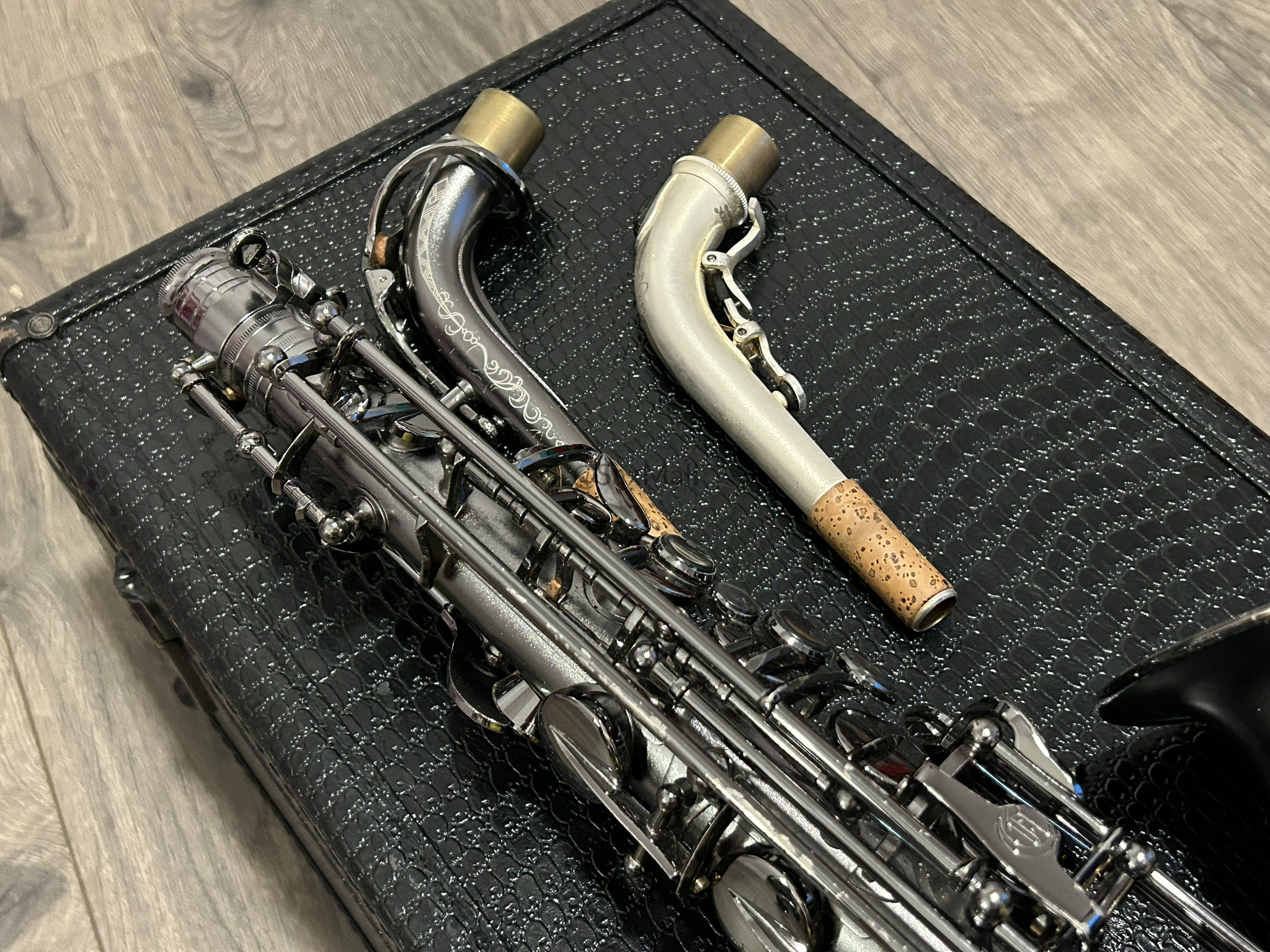 The saxophone is in good overall condition and plays well with no major mechanical issues—pads, corks, and felts are serviceable (recent regulation/setup recommended for optimal performance, as with any used pro horn). It has typical surface scratches and wear in spots from normal use (visible on the body and keys in photos), but no dents, dings, or soldered repairs. The Raven finish still looks striking with its dark, matte iced black-nickel vibe.