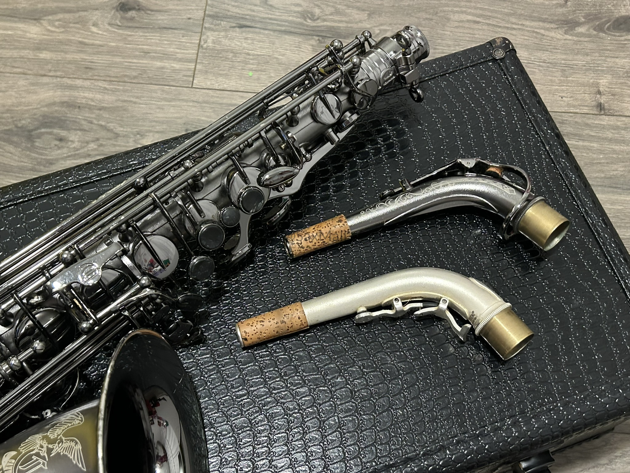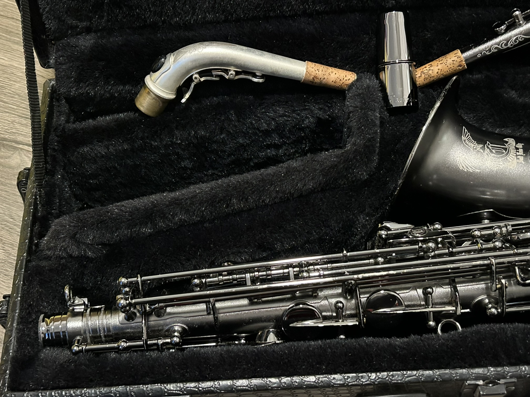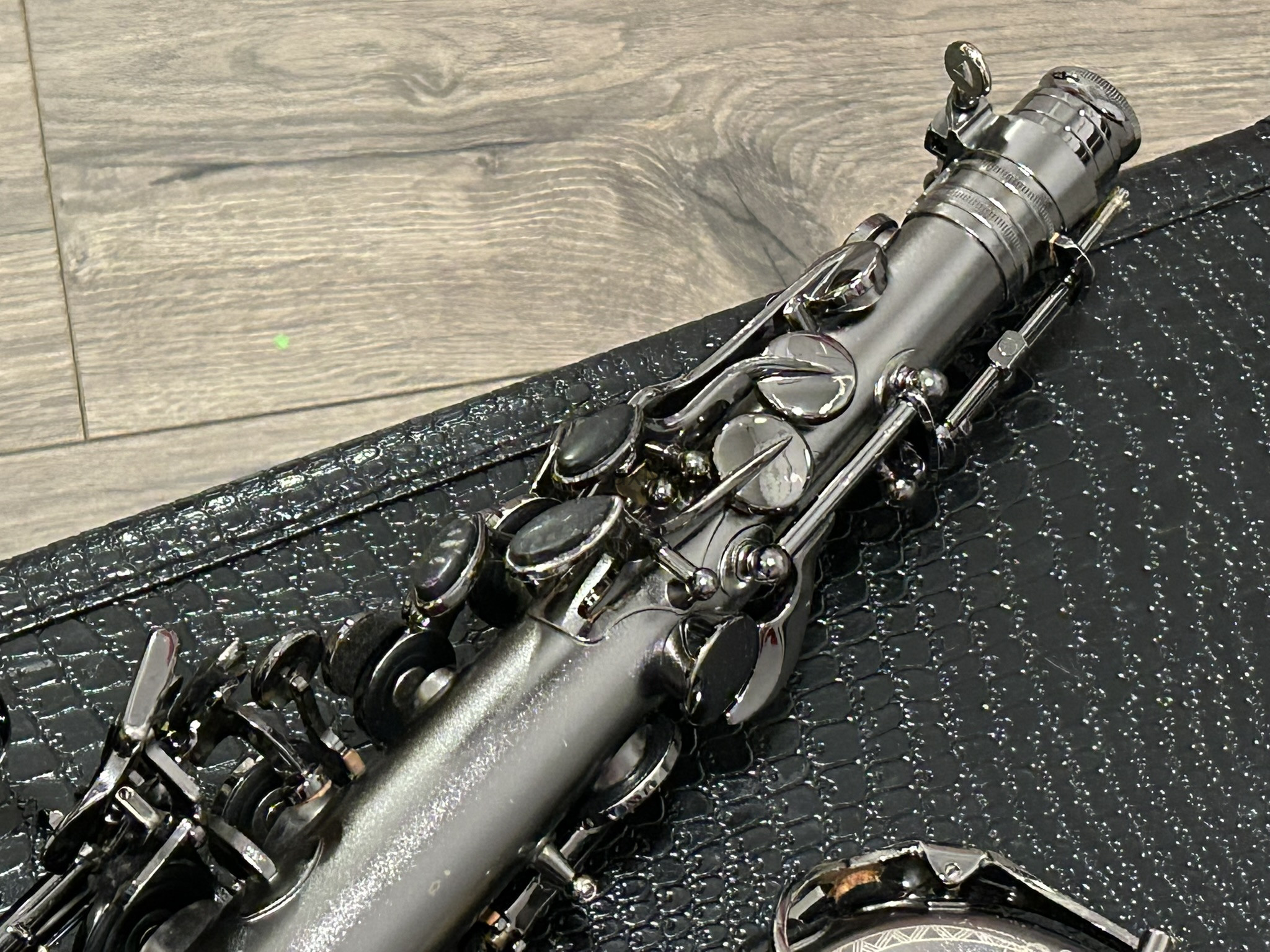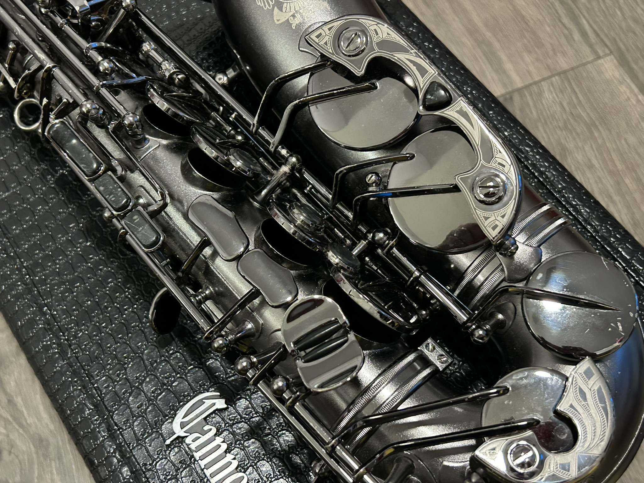 The saxophone is in good overall condition and plays well with no major mechanical issues—pads, corks, and felts are serviceable (recent regulation/setup recommended for optimal performance, as with any used pro horn). It has typical surface scratches and wear in spots from normal use (visible on the body and keys in photos), but no dents, dings, or soldered repairs. The Raven finish still looks striking with its dark, matte iced black-nickel vibe.