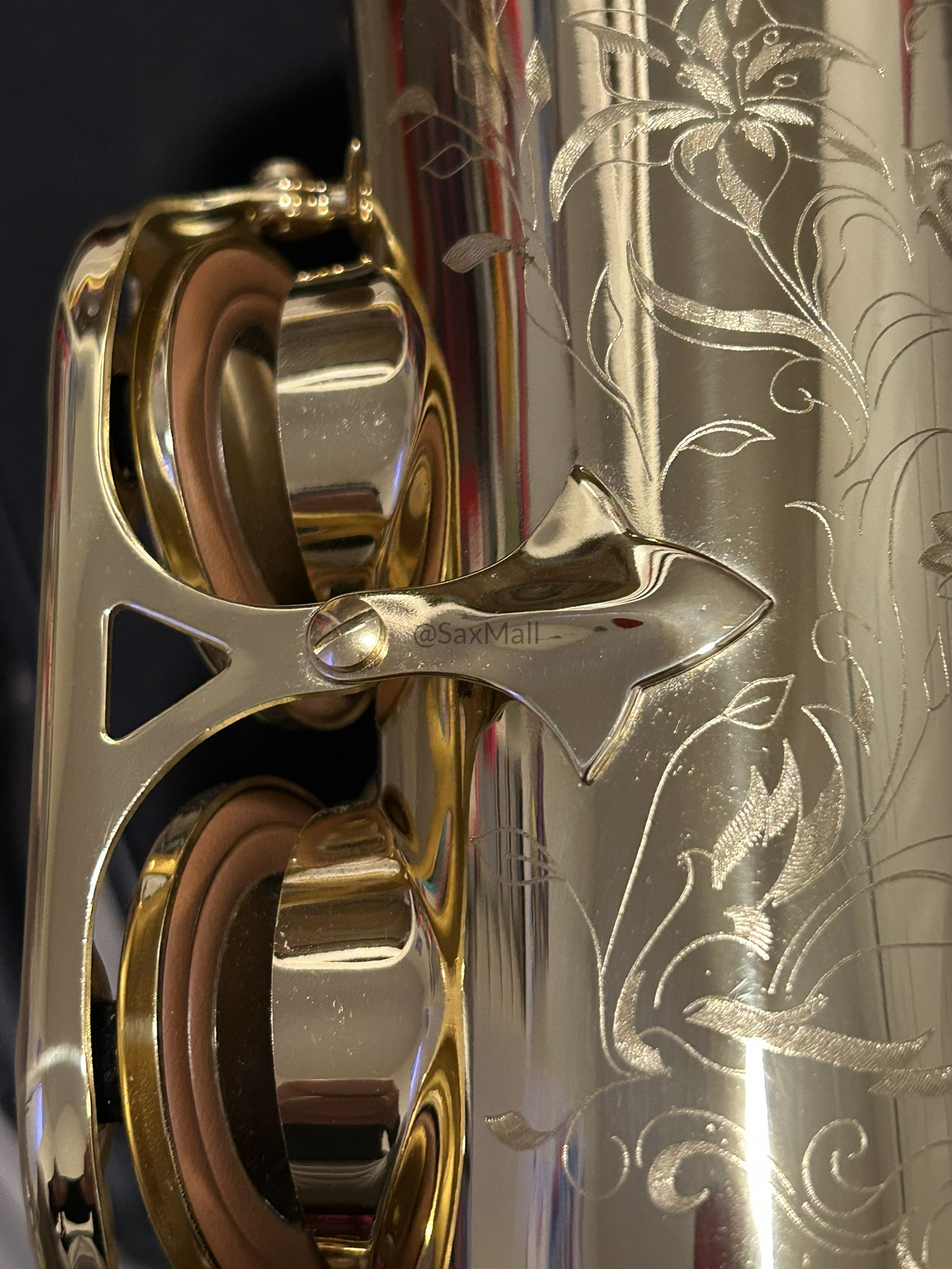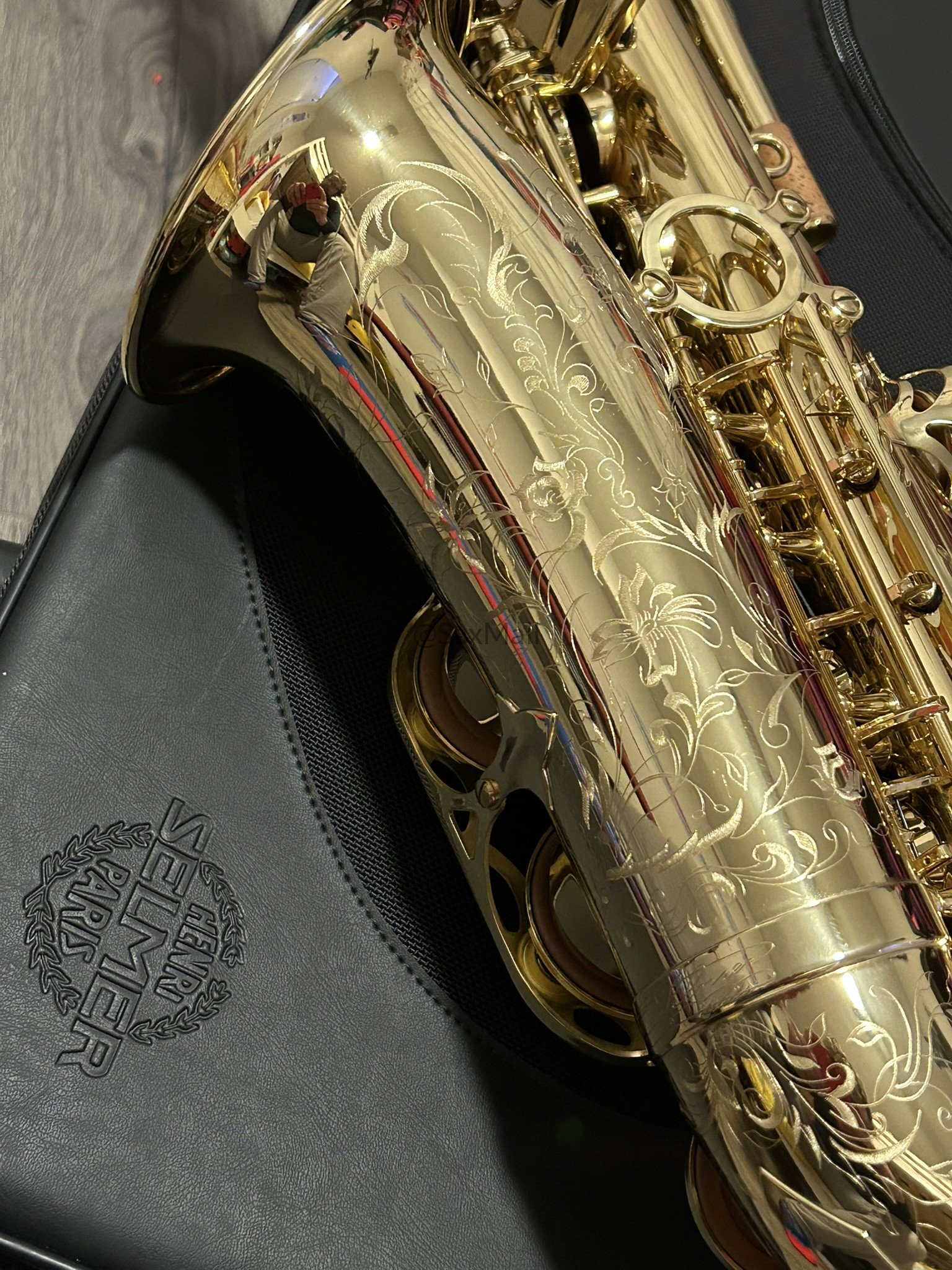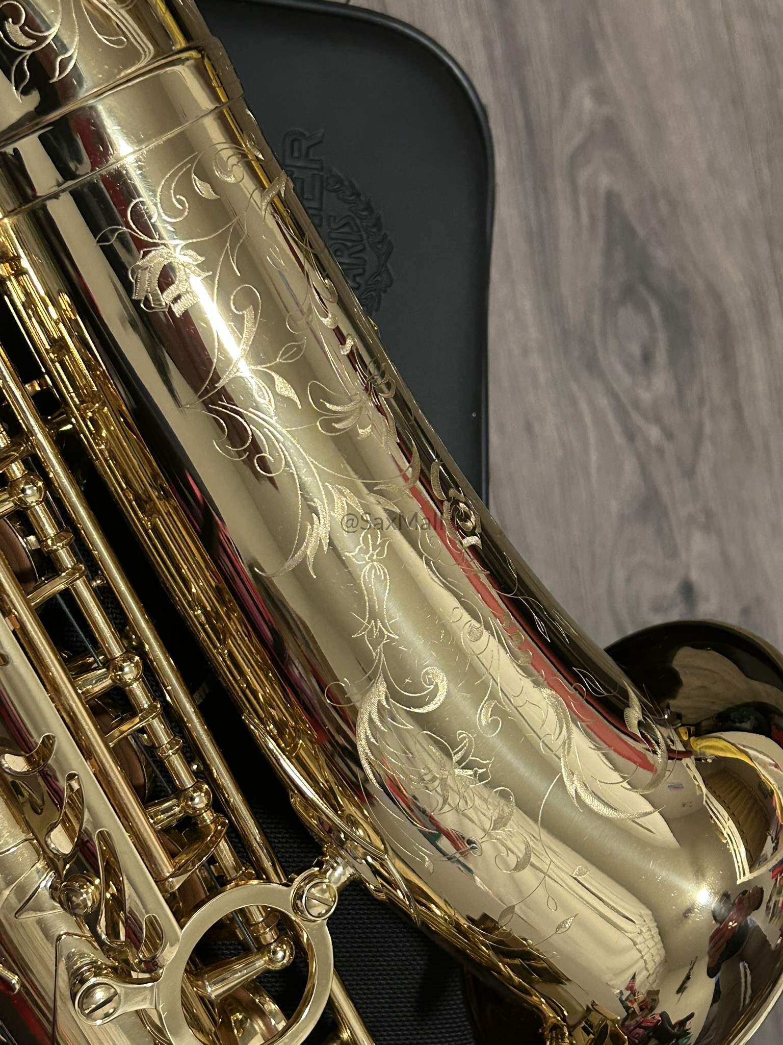 • Gorgeous hand-engraved floral bell and bow with intricate, delicate patterns and the Henri Selmer Paris signature—truly elegant and collectible.