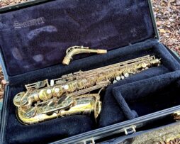 This is a one owner saxophone owned by a professional musician. He retired in 1985 and the instrument has not been played since, other than to be cleaned, it was eventually passed onto his family. Does not come with the original case, but I have it – it is in very rough condition. (If you are interested, please let us know. We also have the tray pack clarinet case but it is being included with the sale of a Vintage Buffet Clarinet.) This saxophone was refinished at some point, lacquer is not original – engravings are not crisp. Pearls are very worn down, but original. Pads will need to be changed for this to be gig ready. Mechanically it is in very good condition, considering the age. Nothing broken or missing.